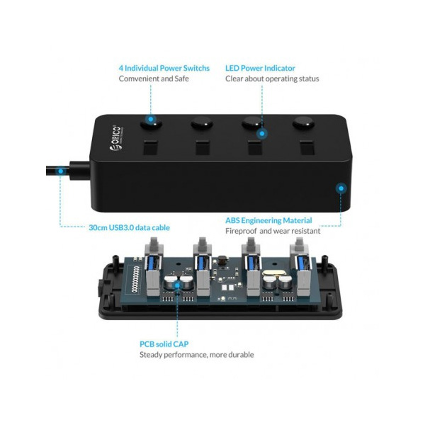 Bộ chia USB HUB 4 cổng USB 3.0, USB 3.0, tốc độ truyền dữ liệu 5Gbps. Tốc độ nhanh hơn 10 lần so với 2.0, Đầu vào (input): 1 cáp: USB 3.0 dài 0,3m, Đầu ra (output): 4 cổng USB 3.0, Đèn LED hiển thị.